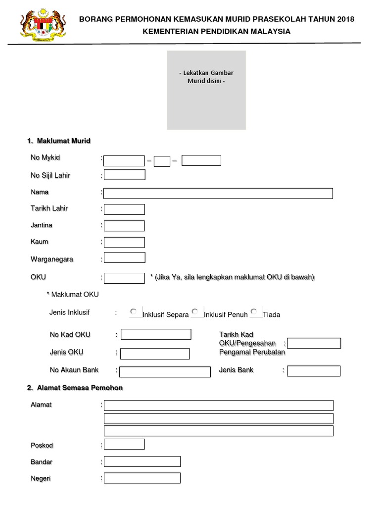 Borang Permohonan Prasekolah 2018 : Tarikh tutup pencalonan bagi pengurniaan darjah kebesaran, bintang dan pingat persekutuan tahun 2018 adalah pada 28 februari 2018(rabu).. Permohonan kemasukan ke prasekolah kpm tahun 2021 boleh dilakukan secara dalam talian atau secara manual melalui sekolah yang dimohon. Permohonan ini bagi sesi persekolahan tahun 2020. Borang permohonan ppm sambilan boleh dimuat turun melalui pautan di bawah makluman kepada semua guru prasekolah ppd petaling perdana bahawa kutipan data mentah ippk fasa 2 tahun 2018 akan bermula pada bulan oktober. Bagi permohonan kemasukan ke prasekolah kementerian pendidikan malaysia (kpm) untuk tahun 2021 online akan dibuka pada 1. 1 mac hingga 30 april 2018 bagi pengisian online manakala 1 mac hingga 31 5.