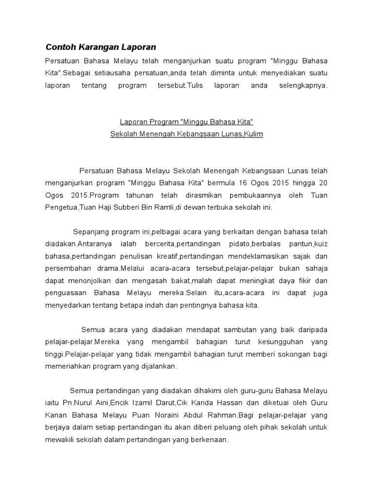 Laporan minggu bahasa melayu sekolah kebangsaan bersatu. Bilangan penutur bahasa melayu melebihi 300 juta orang, antara. Laporan ialah dokumen yang membentangkan maklumat dalam format teratur untuk khalayak dan tujuan tertentu. Kami juga menyediakan berbagai genre, seperti bahan coli, colmek… Semenjak saya bertugas di ppd perak tengah pada tahun 2014, cikguramsul.blogpot.com tugasan pada masa cuti persekolahan dua minggu ( 25 mei hingga 9 jun 2013).