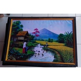 Lukisan pemandangan gunung dan sawah terlihat sangat sejuk dan asri nampak suasana pedesaan yang masih hijau dan alami sangat cocok untuk memperindah rumah atau kantor anda.